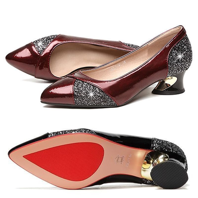 More information about AngryMonkey Women's Pointed Toe Kitten Low Block Heel Pumps Shoes Sexy with Rhinestones Glitter Patent Leather Closed Slip On Bridal Dress Wedding Shoe
