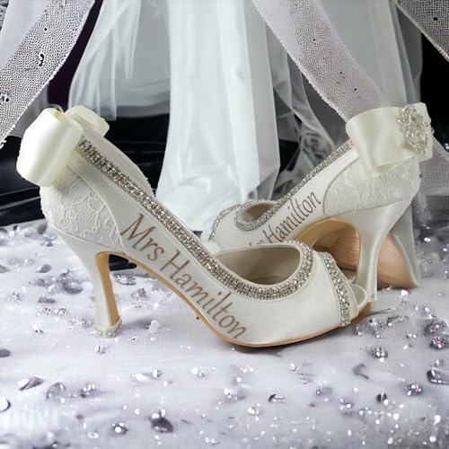 • White or ivory peep toe heels with a 3.5 inch heel with diamonte rhinestone trim