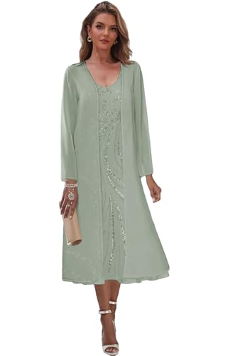 2 Pieces Mother of The Bride Dresses for Wedding Tea Length Formal Dress with Jacket Sequin Evening Gown 6