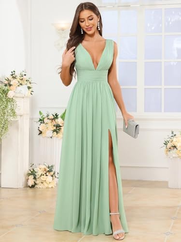 V Neck Chiffon Bridesmaid Dresses for Women Long A Line Formal Evening Gowns with Slit 6