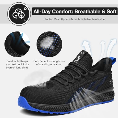 SPIEZ Safety Shoes for Men Women,Lightweight Work Sneakers with Breathable Mesh, Composite Toe, Non-Slip Sole, Easy Pull-On Design.Ideal for Construction, Warehouse & Daily Use, Black/Blue 6