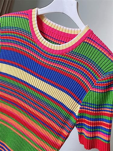 More information about Women Colorful Striped Tight Knitting Dress Summer Short Sleeve Slim Thin Sheath Midi Bodycon Dress