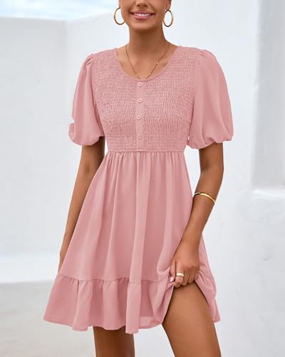 • FEATURE: Wash Tips-Machine Wash & Do Not Tumble Dry / Womens Summer Dresses / Front Decorated Buttons / Crew Neck / Lantern Short Sleeve Dress / Puff Sleeve Dress / Smocked Dress Women / Ruffle Dress / Mini Dress / Solid Color / Side Pockets