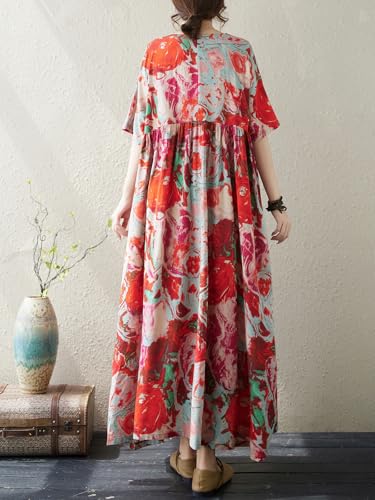 Oversized Dress for Women Summer Vacation Flowy Floral Print Round Neck Short Sleeve Plus Size Boho Dress with Side Pockets 4