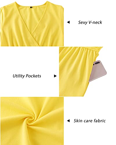 HOT ! Newshows Womens Summer Short Sleeve Casual Dresses V Neck Floral Vacation Sundress Faux Wrap Midi Dress with Pockets