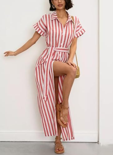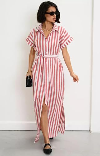 HOT ! utcoco Women's 2025 Striped Short Sleeve Cotton Maxi Shirt Dress Belted Side Slit Button Down Dress with Pockets
