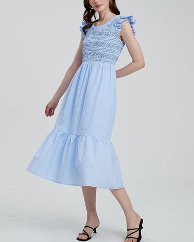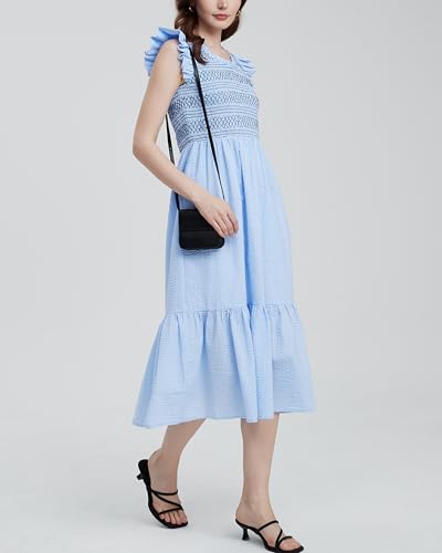 Women's Embroidered Smocked Midi Dress Casual Boho Ruffle Sleeve Crewneck Long Flowy Summer Dress 1