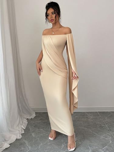 • Type:Bodycon / Sleeve Type:Cloak Sleeve / Details:Draped / Waist Line:Natural / Lined For Added Warmth:No / Neckline:Off the Shoulder / Hem Shaped:Pencil / Pattern Type:Plain / Details:Ruched / Details:Split / Style:Party / Color:Apricot / Sleeve Length:Sleeveless / Fit Type:Slim Fit / Length:Long / Material:Knitted Fabric / Composition:95% Polyester / Composition:5% Elastane / Care Instructions:Machine wash or professional dry clean / Sheer:No / Fabric:High Stretch / Body:Unlined