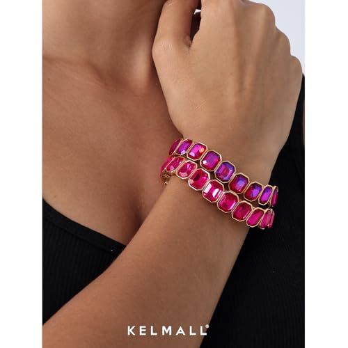 HOT ! KELMALL 14K Gold Plated Stretch Bracelet for Women – Pink Rhinestone Elastic Bangle – Hypoallergenic Statement Jewelry for Daily Wear, Parties and Gifts