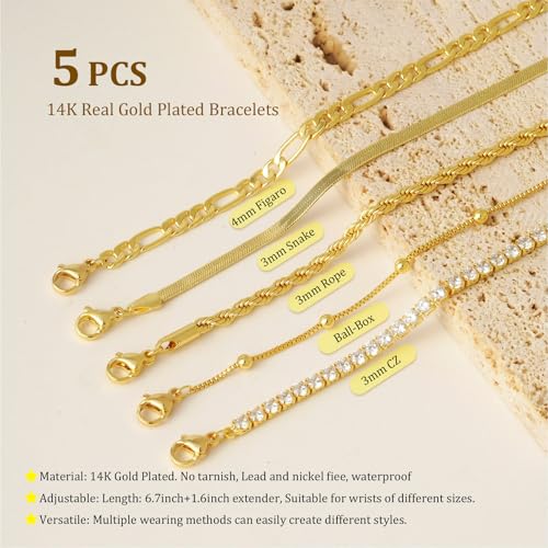 • Stylish & Versatile Bracelet Stack for Women:This elegant gold bracelets for women comes in a set of 4 or 5 chic chain styles, including Tennis chain,Cuban chain, Figaro chain, paperclip chain, snake chain, and rope chain. Designed to be worn separately or layered together, these dainty bracelets create a delicate, trendy look that elevates any outfit with modern charm.