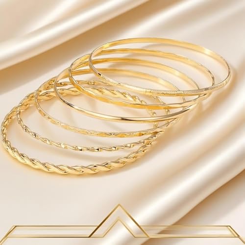 HOT ! Gold Bangle Bracelet, 6 Pcs Gold Plated Dainty Layered Chain, 14K Layer Stackable Cuff Bracelet Set for Women (Gold)
