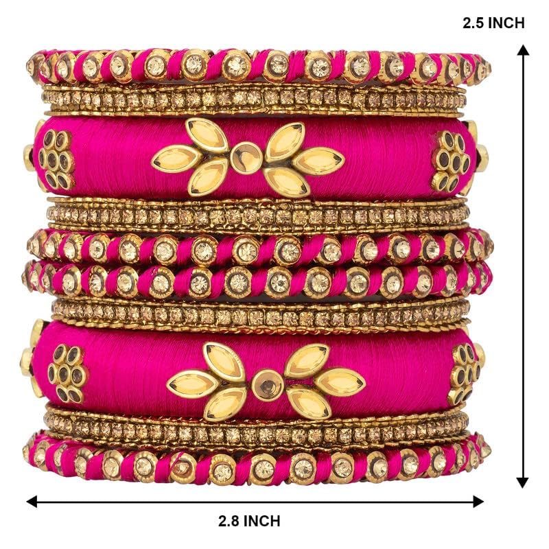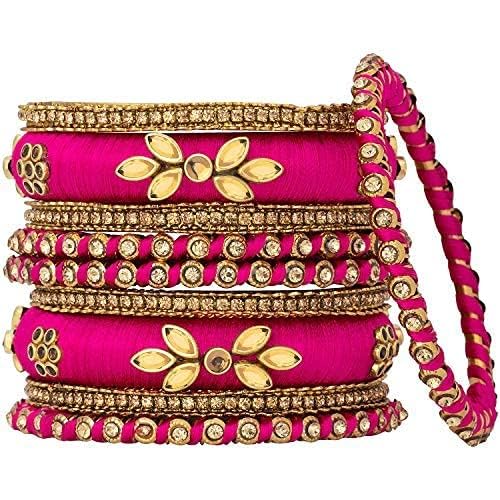 Aheli Royal Design Silk Thread Bangle Set Saree Matching Chuda Indian Traditional Wedding Fashion Jewelry Gift for Women (Silk Rani Pink-Faux Stone, 2.8) 1