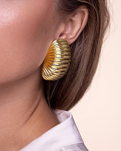Large 18K gold plated Chunky Clip on Statement Earrings for Women, Bold Handmade Exaggerated Trendy Seashell Ribbed Jewelry Gifts, Curved Half Circle Textured Summer Beach Fashion Earrings Accessories, Big Vintage Irregular Hammered Thick Circular Nickle Free Cuff Huggie Earrings. 1