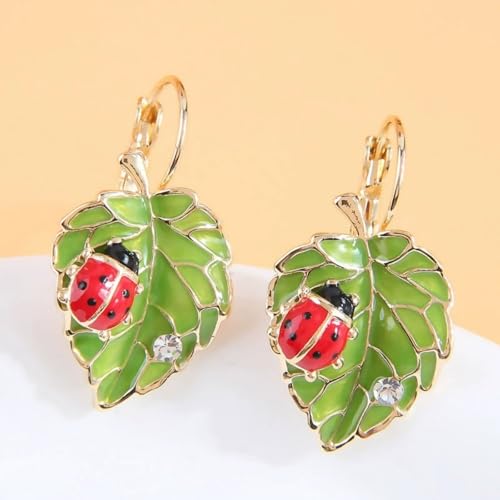 HOT ! Bohemian Green Leaf Bug Ladybird Earrings for Women Lightweight Cute Insect Ladybug Leverback Earrings