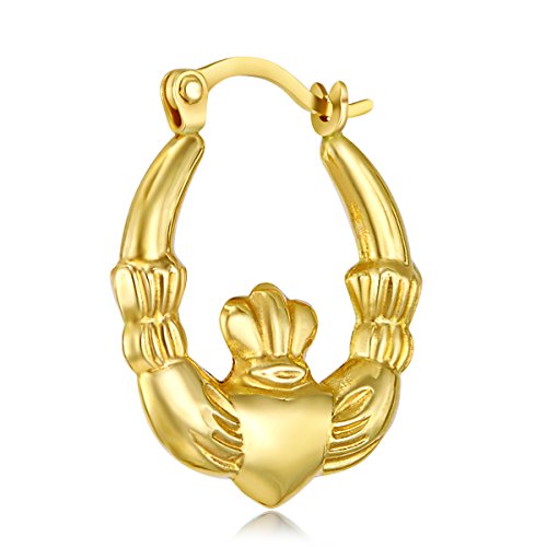HOT ! 14k REAL Yellow Gold Fancy Claddagh Hoop Earrings (15 x 15mm)