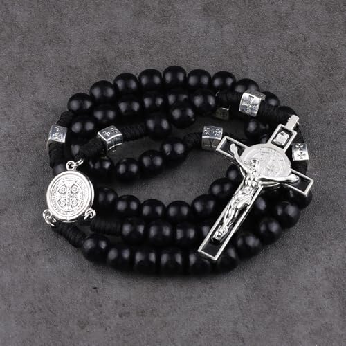 12mm Black Wood Beads Rosary with St.Benedict Metal Center Piece Necklace 21inch with Medal Crucifix for Men 6