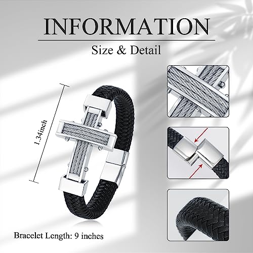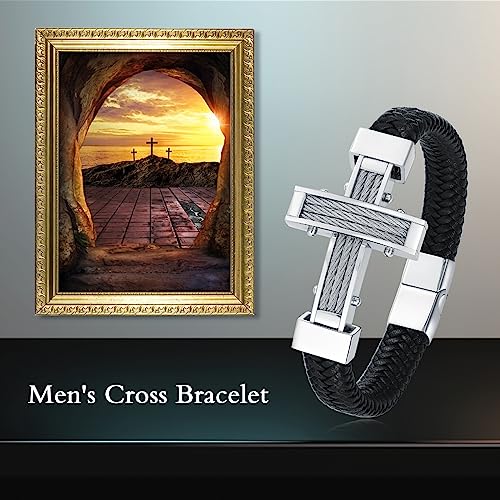 Mens Crucifix Braid Bracelet Cross Leather Cuff Bangle Bracelet with Stainless Steel Clasp Wristband Jewerly Birthday Gifts for Dad Husband Boyfriend Brother Son 3