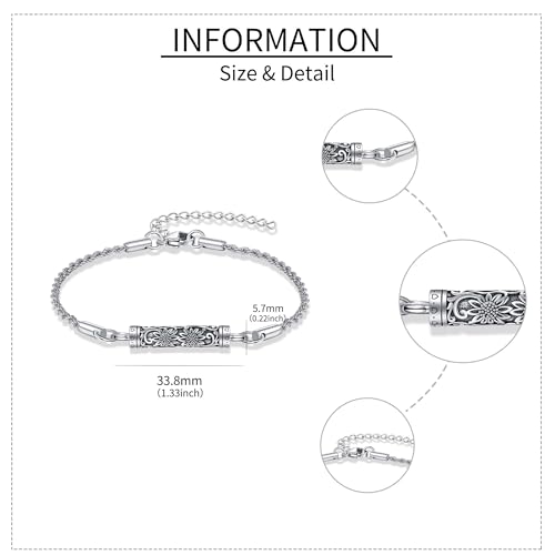 • ❤ Keepsake Memorial Cremation Jewelry❤: The Urn Bracelet is Sterling Silver, Nickle Free, Hypoallergenic,never rust, corrode, rust or stain. Urn Pendant size: about 1.33*0.22 inch, chain 7 inch+2inch.
