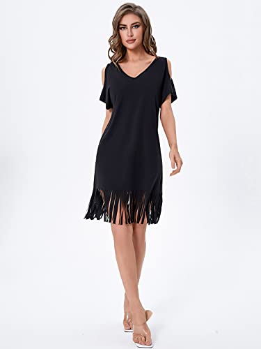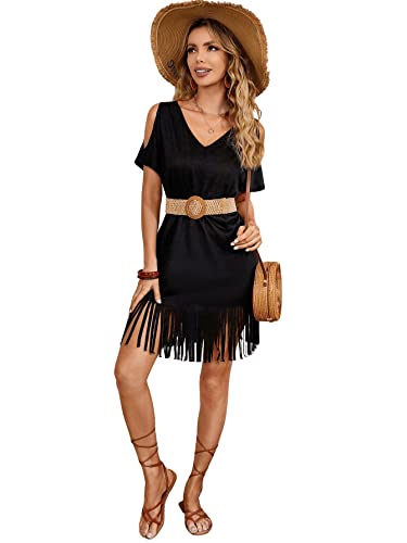 HOT ! Verdusa Women's Cold Shoulder V Neck Fringe Hem Straight Dress Without Belt