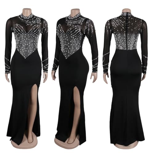 HOT ! WOKANSE Women's Formal Dresses Mock Neck Sexy Mesh See Through Long Sleeve High Slit Sparkly Rhinestone Prom Dress