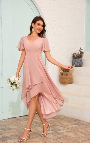 POMUYOO High Low Bridesmaid Dresses Chiffon V-Neck Short Sleeve Ruched Modest Formal Gowns for Wedding 1