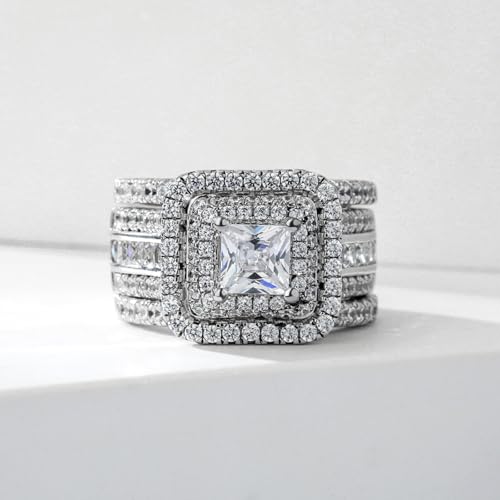 • ☀Design features: Your love shines brightly with this exceptional wedding set. Crafted in sterling silver, this spectacular design showcases a princess-cut center stone wrapped in triple halo cushion-shaped frames. Captivating with stones and a brilliant buffed luster, this scintillating wedding set is the look she's waited for all her life.