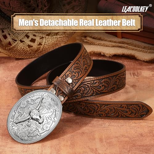 HOT ! LEACOOLKEY Men's Leather Belt Western Cowboy Leather Belt for Jeans Pants Snap Belt with Detachable Buckle