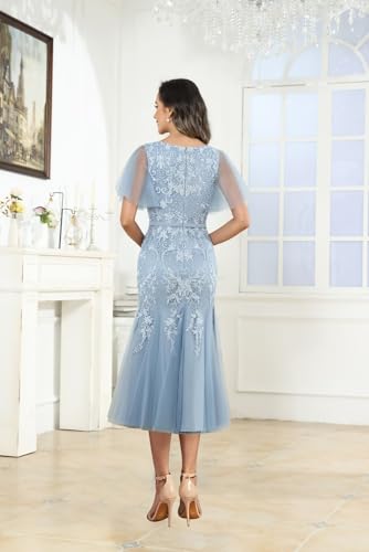 • Features: Elegant streamlined mermaid silhouette, flowy tulle, v neck, short sleeve, tea length, lace applique, ruched, zipper back, empire waist, corset. This bodycon mother of the bridesmaid dress is made of skin friendly fabric, comfortable to wear and showcase your charming figure curves.