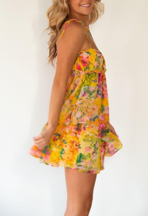 • Feature: Yellow floral print, adjustable spaghetti strap short mini dress, cute a line sun dress, bohomian dress for teen girls, bohomian dress for women, corset mini dress, coquette dresses for women
