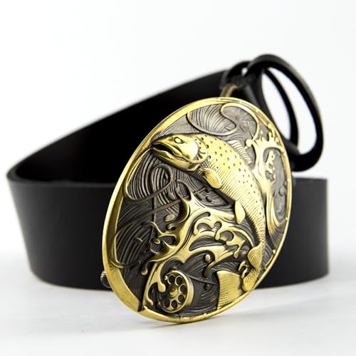HOT ! Leather Belt with brass buckle Trout, Handmade fisherman solid brass belt buckle Salmon