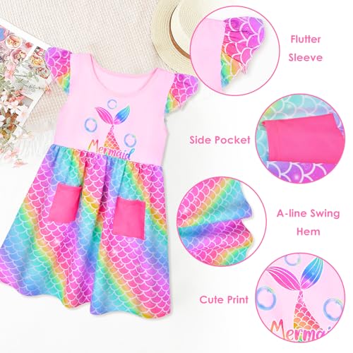 Little Toddler Girls Dress Flutter Sleeve Cute Mermaid Dinosaur Floral Summer Dresses Sundress with Pocket 2-7 Years 4