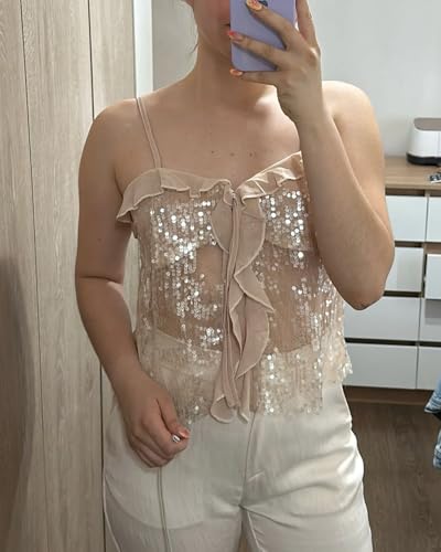 • Features: Featuring delicate sequined design and spaghetti straps, ruffles, cropped length, lace-up tie front decoration, this cute cami tops for women exudes a feminine and trendy vibe
