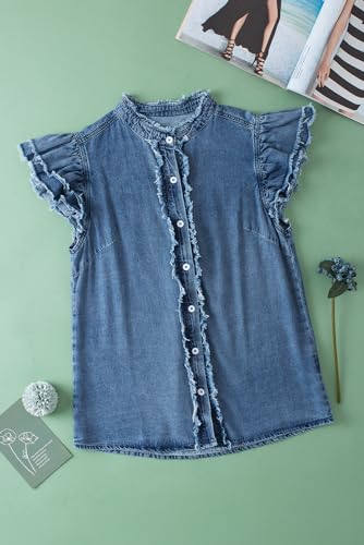 Chvity Summer Women's Button Down Denim Tops Ruffled Flutter Sleeve Blouse V Neck Casual Shirt Tops 5