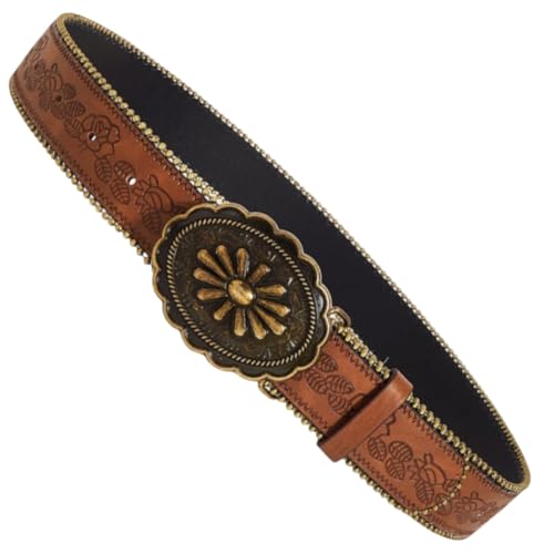 40.55 x 1.5 Inch Country Western PU Leather Belt with Retro Oval Flower Alloy Buckle Brown Adjustable Vintage Cowboy Cowgirl Embossed Waist Belt for Men Women Jeans Pants 5