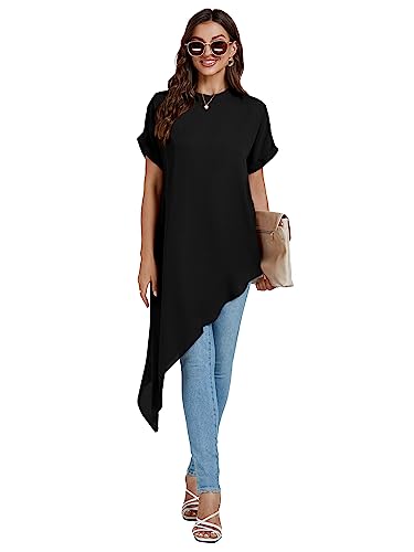 • Elegant mock neck loose fitted tunic shirt for women short sleeves with asymmetrical hem, classic crewneck, loose fit shirts design, provides a flattering and elegant look.