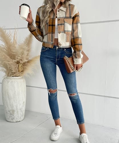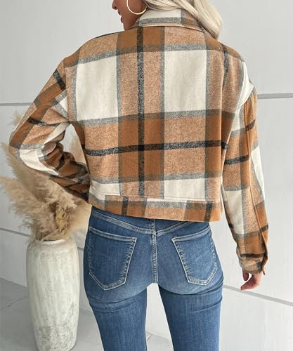 Jackets for Women Cropped Shacket Plaid Button Down Shirt Long Sleeve Flannel Coat Tops with Lapel Pocketes 6