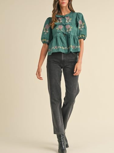 More information about Womens Short Puff Sleeve Floral Embroidery Poplin Front Self Tie Detail Peplum Top Blouse