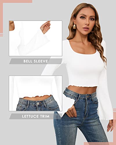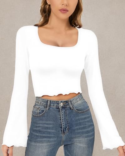 HOT ! CLOZOZ Bell Sleeve Crop Tops for Women Square Neck Long Flare Sleeve Lettuce Trim Shirts Slim Fitted Sexy Casual Trendy Tops