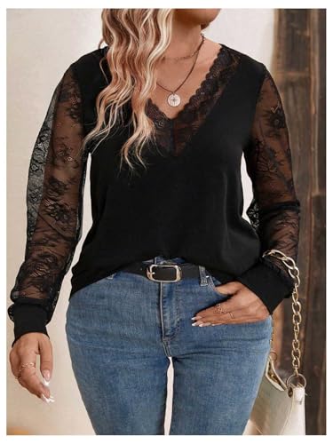 HOT ! SweatyRocks Women's Plus Size Lace Tops Mesh Long Sleeve V Neck Fitted Tees Shirts