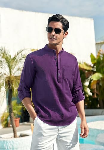 • Design : The linen shirt uses classic henley band collar with pocket design. The agraffe is designed to hold the cuff when the long sleeves are rolled up, loose fit make the shirt strike the perfect balance between casual and stylish.