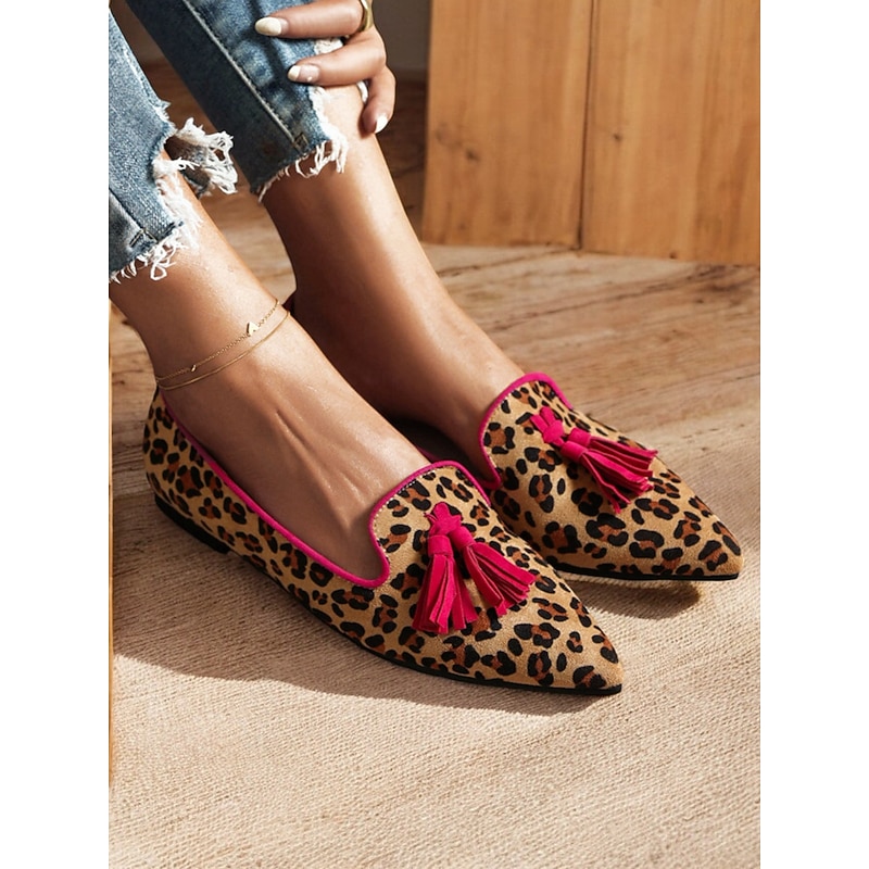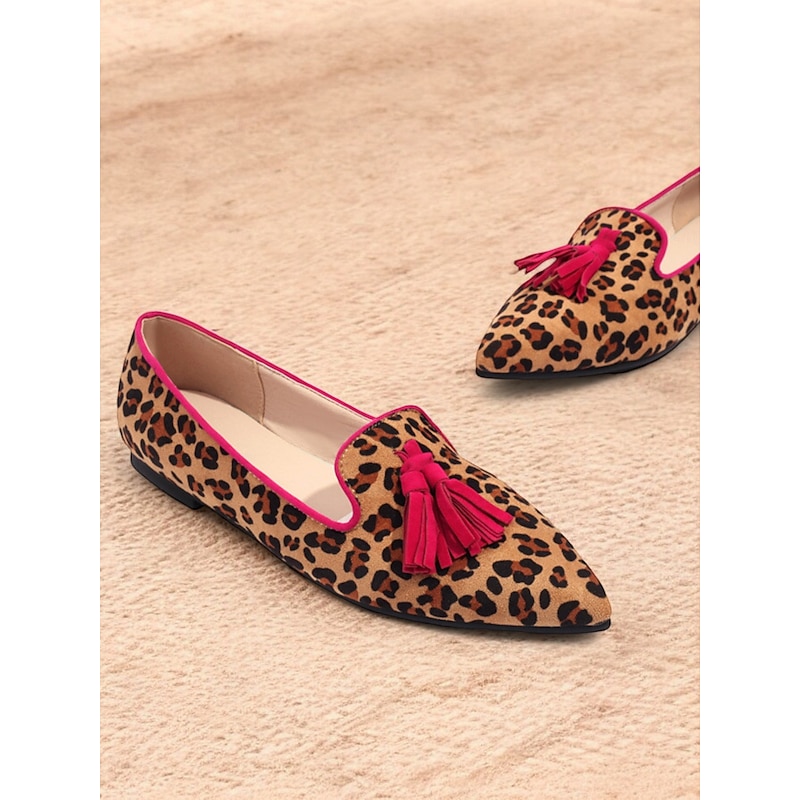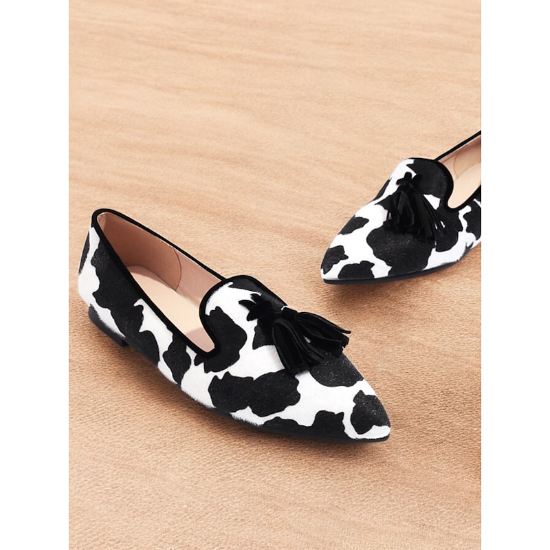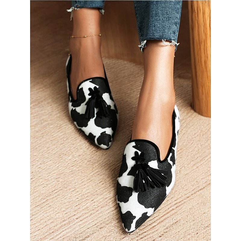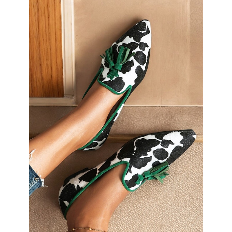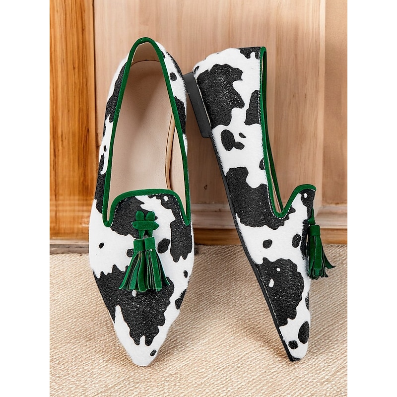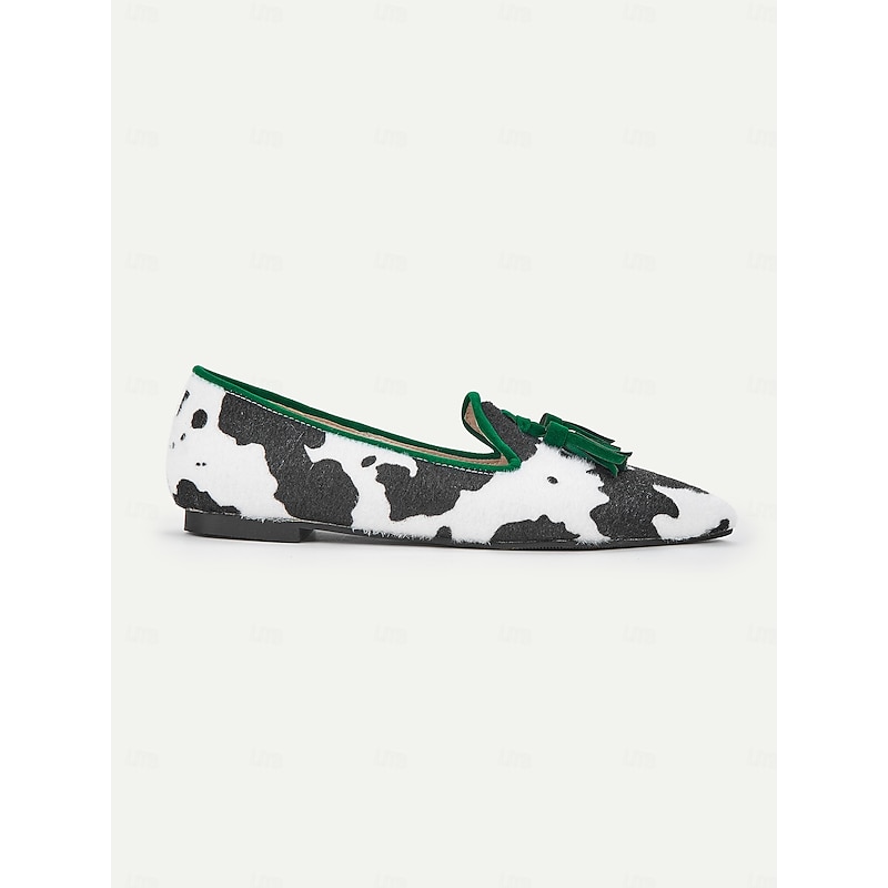 Highlights [Women’s Cow Print Tassel Loafers with Green Trim: A Chic and Stylish Choice] [Material and Fabric:] These loafers are crafted using high-quality faux fur and faux suede materials, providing a luxurious yet durable texture. The interior is lined with synthetic leather, ensuring comfort throughout the day. [Fit and Silhouette:] Designed in a classic loafer silhouette, these shoes feature a pointed toe that adds a modern and sleek touch to any ensemble. The flat heel ensures ease and versatility for daily wear. [Design Highlights:] Adorned with striking black-and-white cow print patterns, these loafers stand out as a statement accessory. They are embellished with playful and elegant tassels in vibrant green on the vamp, and complemented by green trim around the opening, creating a harmonious and polished look. [Occasions and Use:] Perfect for both casual and semi-formal occasions, these versatile loafers can effortlessly transition from a day at work to an evening gathering. Their vintage and comfort style makes them suitable for any season, be it spring, summer, fall, or winter. [Size Range:] Available in a range of sizes from US5.5 / EU35 to US10.5 / EU42, these loafers are designed to fit true to standard sizing. It is recommended to select your usual size for the best fit.