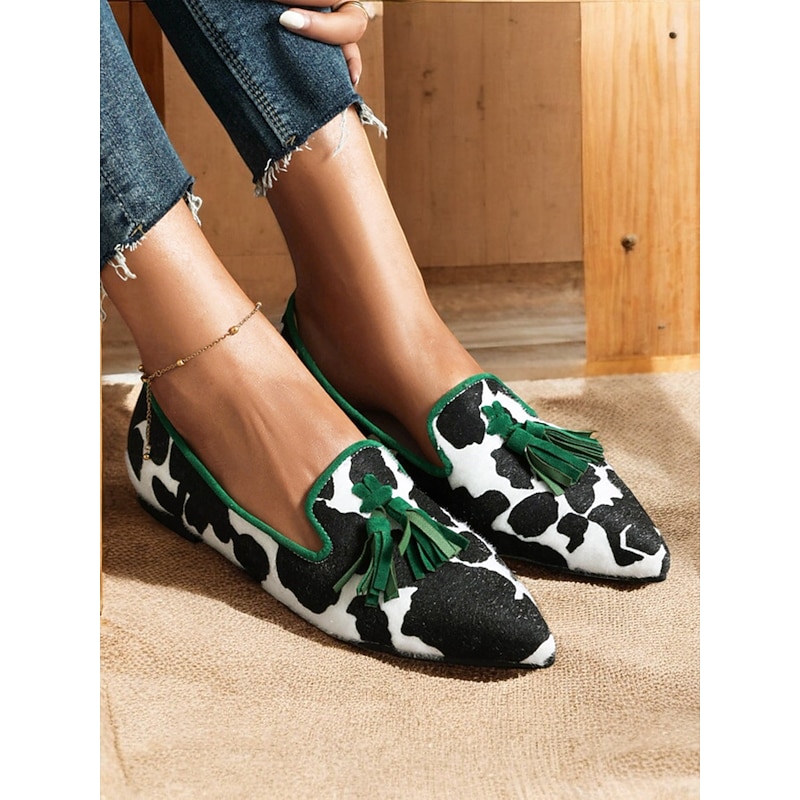 Women's Cow Print Tassel Loafers with Green Trim – Stylish Slip-On Dress Shoes for Casual and Formal Occasions 24
