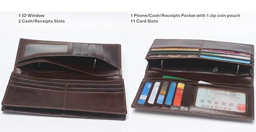 • Structure: 11 Credit card slots, 2 long slots for cash, 1 open pockets for checkbook or phone and a ziped coin purse.