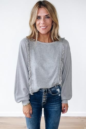 More information about Light Grey Waffle Patchwork Long Sleeve Raw Hem Pullover Top