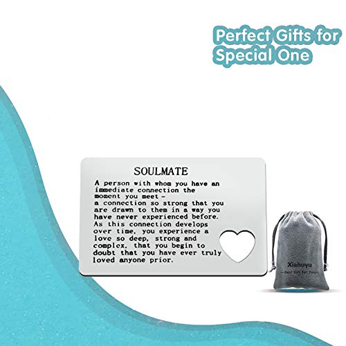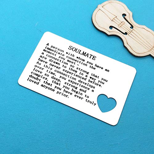 • Wallet Card for Men: Engraved with sweet words “SOULMATE a person with whom you have an immediate connection the moment you meet-a connection so strong that you are drawn to them in a way you have never experienced before.As this connection develops over time,you experience a love so deep,strong and complex,that you begin to doubt that you have ever truly loved anyone prior.” A wonderful way to show your special love to your lover.