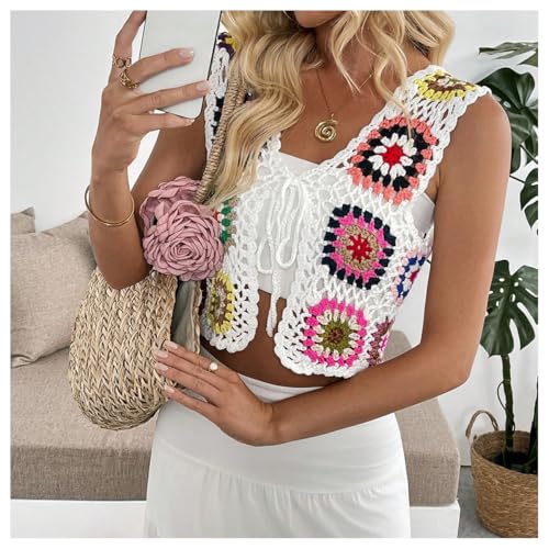 HOT ! Verdusa Women's Boho Floral Hollow Out Tied Sweater Vests Crochet Cropped Cardigan