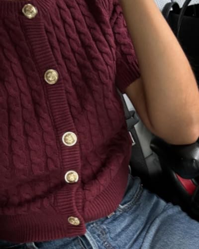 Women Cable Knit Short Sleeved Sweater Cardigan Casual Button Up Soft Solid Sweater Shirt 6