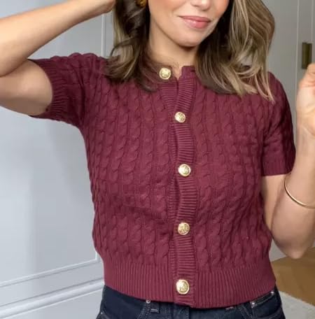 Women Cable Knit Short Sleeved Sweater Cardigan Casual Button Up Soft Solid Sweater Shirt 1