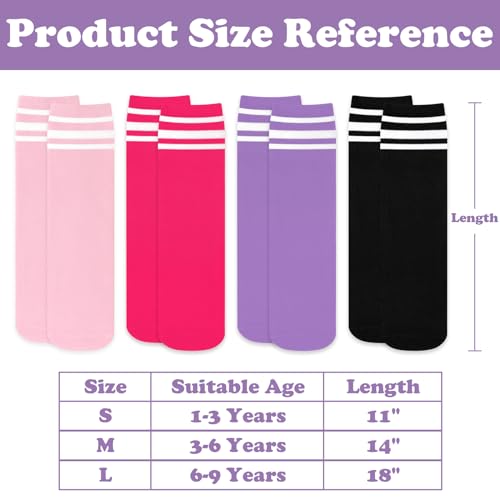 • PACKAGE & SIZE INFORMATION: Each package contains 4 pairs of toddler soccer socks for easy cleaning and replacement. And our soccer socks youth come with 3 sizes for children ages 1 to 9. The boot length of Size S is about 11 inches and suggests to 1-3 years old, Size M is 14 inches and suggests to 3-6 years old, Size L is 18 inches and suggests to 6-9 years old. Please carefully choose according to the size chart and applicable age range. Suggest Hand Washing and Air Dry! No Iron! No Bleach!