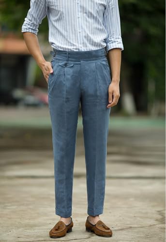 HOT ! Ceehuteey Men's Linen High Waisted Trousers Comfortable Lightweight Summer Trousers Adjustable Waist Cotton Straight